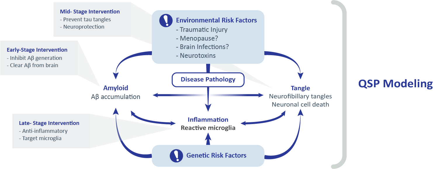 Given the complexity of AD, a QSP modeling approach is often the most preferred approach. QSP allows us to integrate knowledge and data to quantitatively describe the different biological and physiological mechanisms related to disease progression. As such, this is a very useful tool when trying to understand the effect of drugs with different targets while helping to make decisions on specific points of interventions to optimize possible AD treatments based on mono- or combination therapies (see Figure 1 for a QSP model and the ecosystem of AD opportunities it represents).