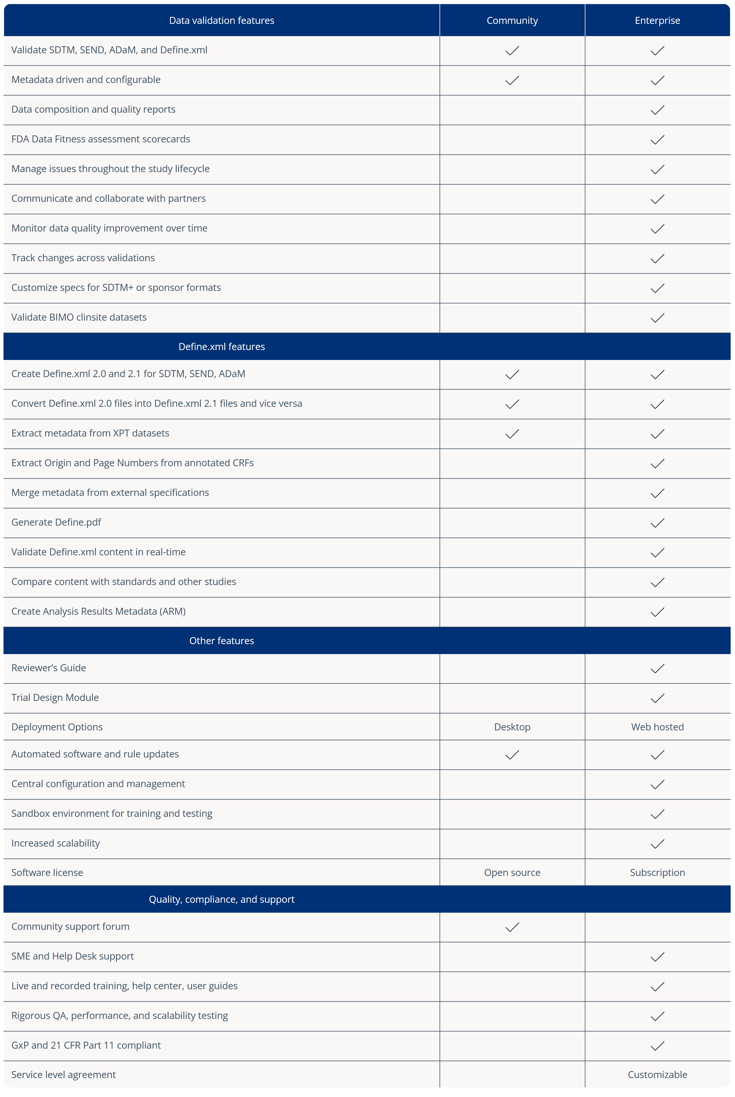 Summary: Pinnacle 21 Community is a good starting point for individual programmers or early-stage studies. Enterprise goes beyond basic validation, providing measurable indicators of regulatory impact, and guidance towards submission readiness.