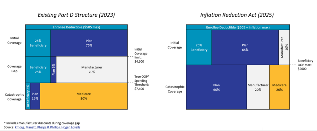 - Replacing the current “coverage gap” program with a new manufacturer “pay to play” program and a CMS reinsurance policy (2025)