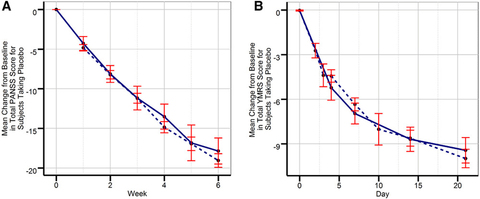 Figure 1: Comparison of placebo response in adult and pediatric patients. Solid and dashed blue lines represent the pediatric and adult patient populations receiving placebo (Adapted from Kalaria et al., 2021).