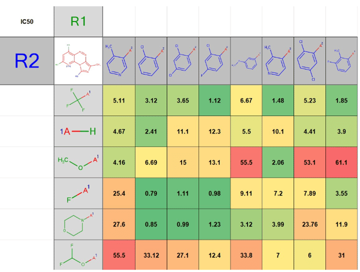 In the analyze phase, Marco uses a variety of structure-activity relationship (SAR) tools to investigate which structural classes and variants show promising activity, and which are to be avoided. Tabular views of live structures, scaffolds, and substituents coupled with assay results and other structure-derived properties such as DMPK characteristics can be explored and visualized using R-group decomposition and substructure searching: and these require a rich set of chemical query feature drawing tools to detect the most promising lead candidates.
