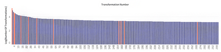 图 2. Number of occurrences and a few selected examples (orange bars) from the top 300 transformations (blue bars) in small molecule drug discovery projects, extracted from SureCHEMBL