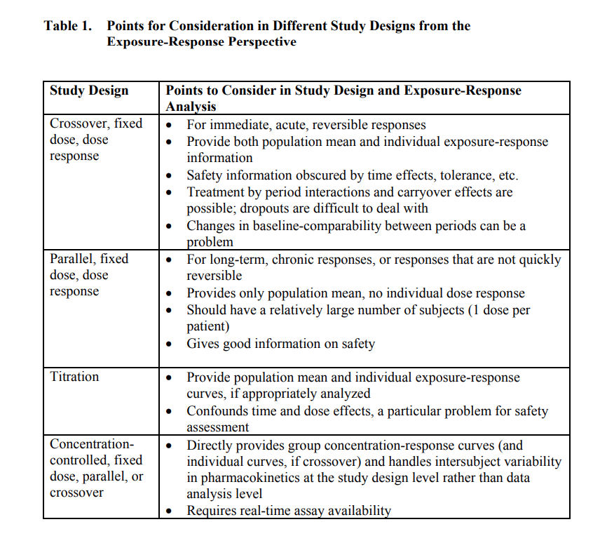 Often, sponsors conduct clinical studies using trial designs that are more “fit for purpose” and address the immediate issue at hand. The choice of study design could affect the way PMX analyses are set up. Before each study design discussion, the modeler and the trialist should collaborate to determine the optimal study design with the best operating characteristics that would optimally inform planned analyses. The FDA exposure/response guideline reflects nicely on such choices.