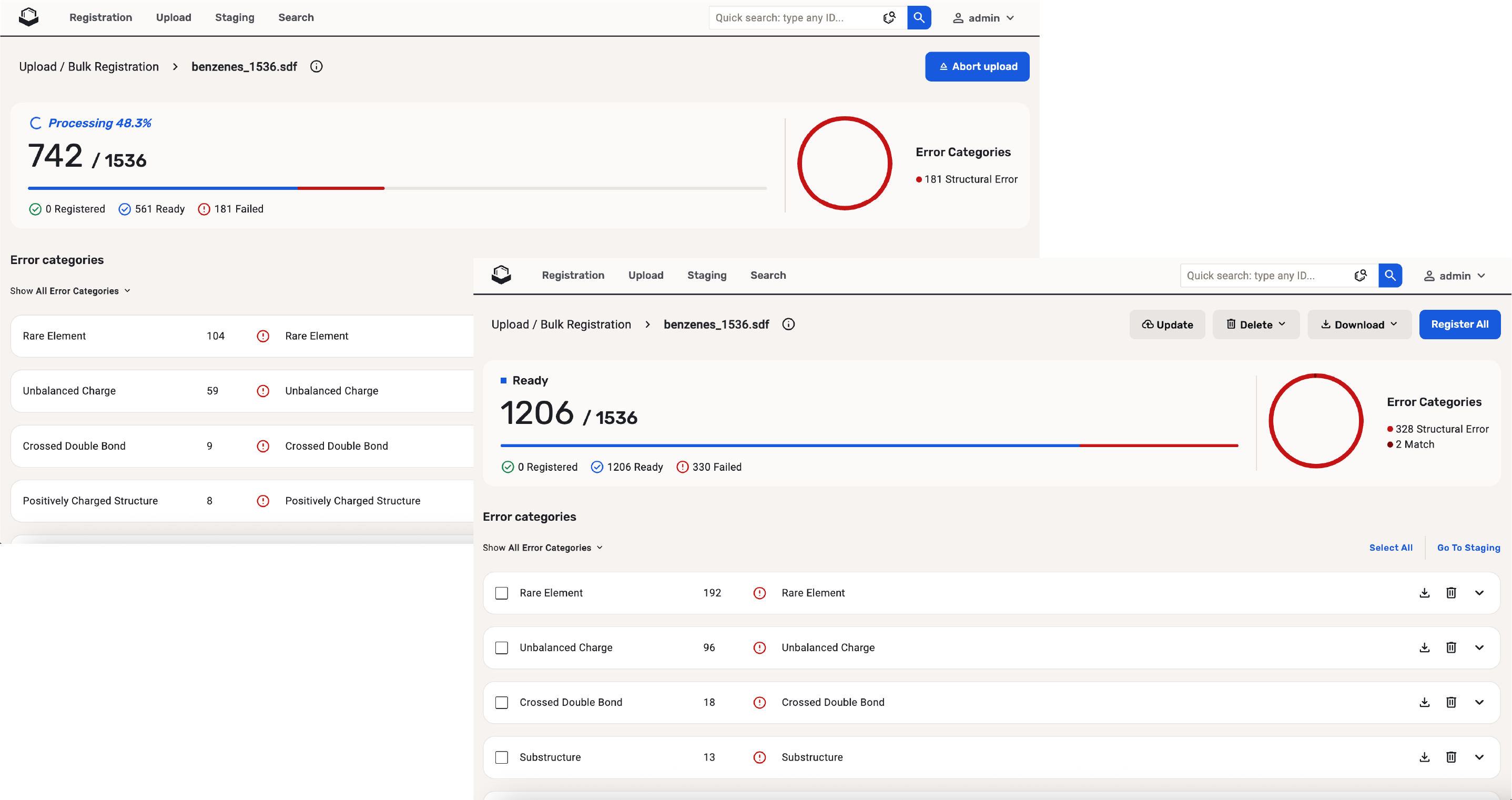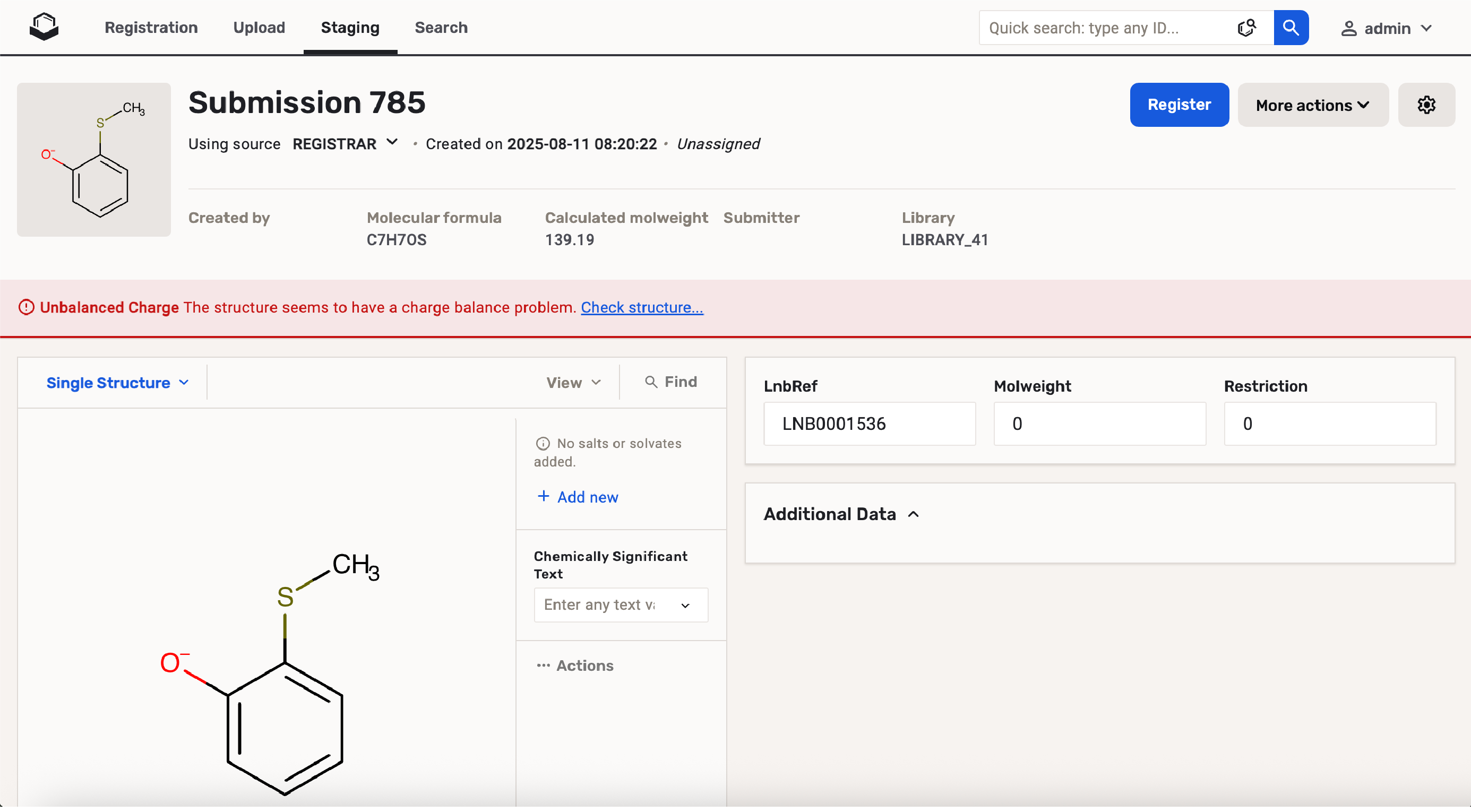 You can automatically take compounds through normalization and quality check before registration, or intervene in case any criteria is violated. Compound Registration fixes most issues, moving exceptions to a staging area to handle manually.