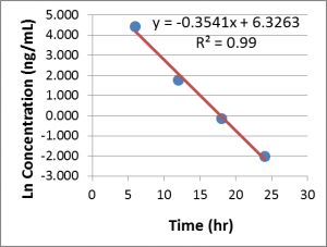 That’s all you need to do to calculate the elimination rate constant. If you are calculating the slope by hand, don’t forget to log-transform the concentrations before you use them in any slope calculations.
